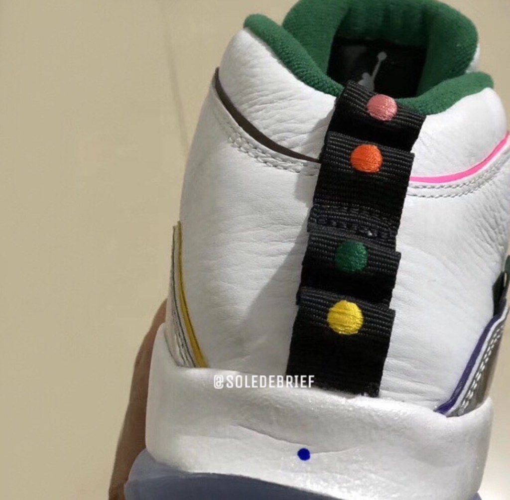 The Jordan 10 “Wings” is features a white leather upper with a silver side panel and multiple colour lining on the edge of the leather finish. The outsole is translucent showing the text “Wings” on the bottom and it features multiple pull tabs with different coloured dots on each pull tab. The official release dates on these shoes haven’t been confirmed yet.
