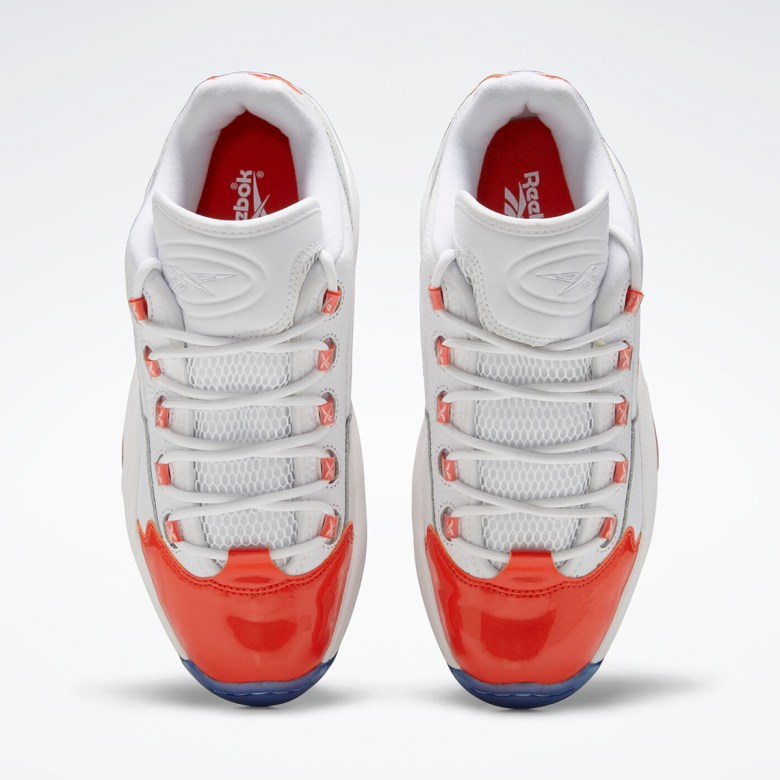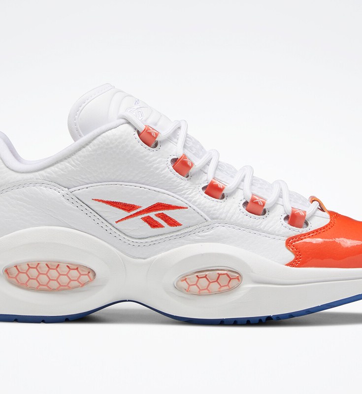 The “Vivid Orange” has a white tumbled leather base with orange accents in the lace eyelids and the Reebok logo on the side. Bright orange patent leather is used on the toe cap and heel logo which houses the “Question” logo. The midsole uses “Hexatile” cushioning with the distinct honeycomb patterns being highlighted in orange. The outsole is a translucent outsole with Allen Iverson’s number the #3 embroidered on at the back.