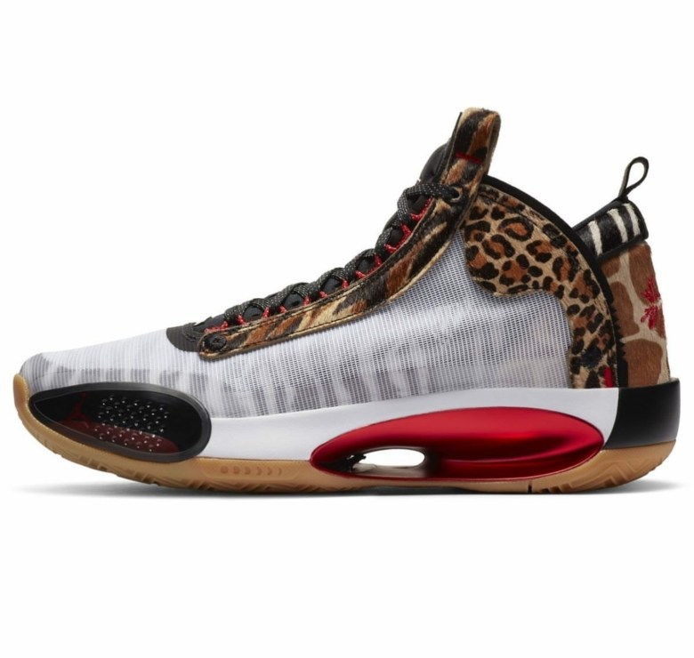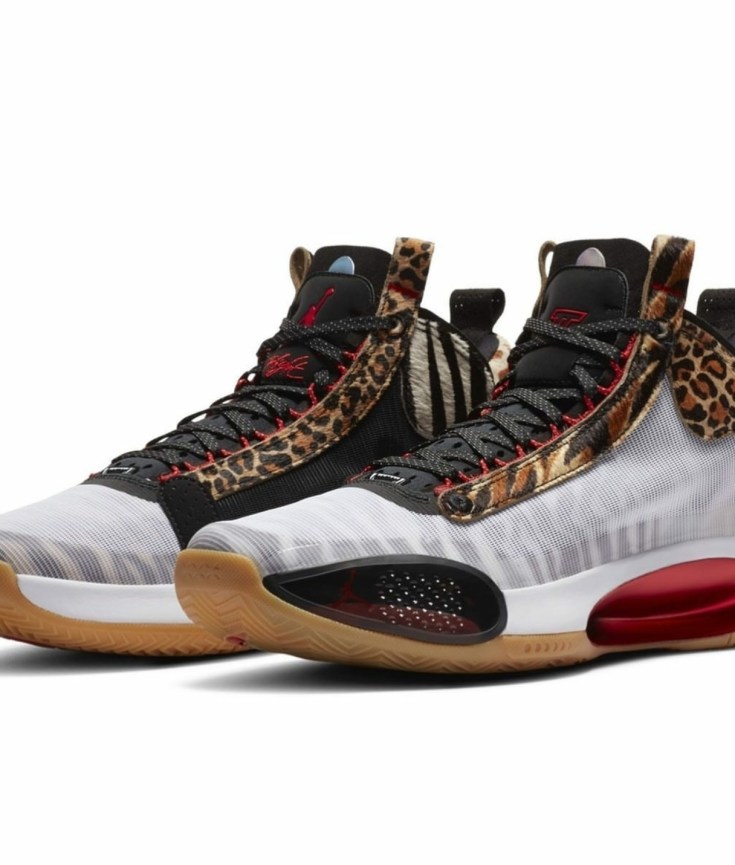 With a safari themed colourway, the overlays and the heel is made up of different animal prints from giraffe, zebra and cheetah in a patchwork arrangement. The white mesh base with subtle black accents are used to highlight tiger stripes. Sticking with the safari theme, the shoe features a tongue tab with teeths and “Welcome to the Zoo” embroidered on the heel of the shoe. The shoe is finished with a white and black contrasting midsole and with a metallic red “Eclipse plate” and a gum outsole. Details include Jayson Tatum’s logo on the left tongue of the shoe and his son “Deuce” embroidered on the inside of the tongue of the shoe.
