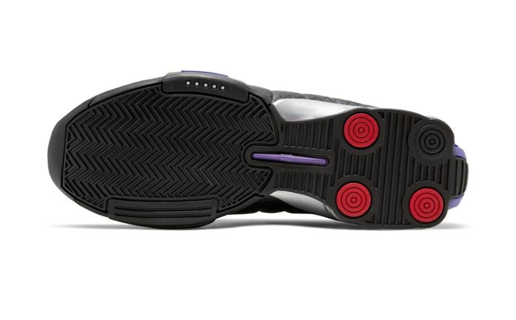 The Nike BB Shox “Raptors” takes note from the vintage Raptors colours in red, black and purple. The whole upper is made of black leather with a mixture of smooth leather and pebbled leather. The heel features a bright red leather accent with purple, red and black strips of fabric covering the heel. The silver metallic external heel sits on top of the iconic Shox pods that are highlighted in Raptors purple. The shoe is finished off with a solid black outsole. Additional details include the Raptors scratch marks that are painted in 3M to reflect the scar marks in the dark.