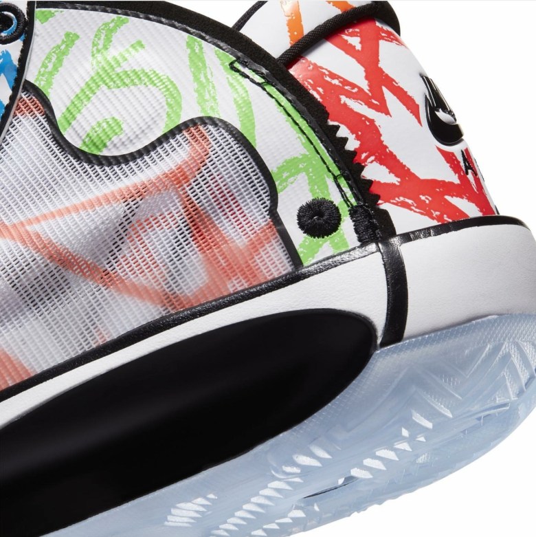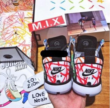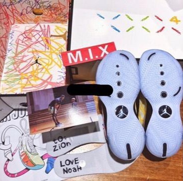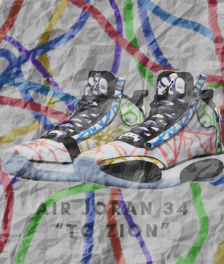 The design team at Jordan worked with Zion’s brother Noah to create this colourful player’s exclusive pair. Outside the box, “XXX4” is printed to look like is it written using crayons and the inside has crayons scribbled all over the box with different colours. Noah’s personal hand written, “To Zion”, “Love Noah” is printed on the box and the insoles. The Jordan 34s also feature a colourful scribble printed upper and black marker lines highlighting the outlines of the shoe. The white midsole which is left untouched sits on top of a icy translucent outsole. Each pair includes a Jordan 34 colouring book and a photo of Zion and Noah together.