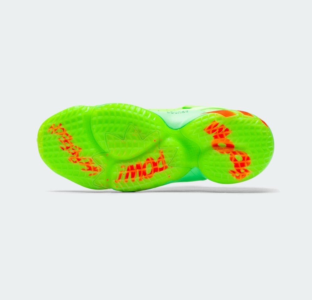 The whole shoe is dressed in different shades of neon green, reminiscent of the radioactive spider in the comic books. The laces, stitching and the logos are coloured in Spiderman’s signature bright red. Additional details of Spiderman include the lace tab that reads “SPIDEY SENSES” and common comic book sound effects written on the bottom of the outsole. Inside the tongue features a drawing of Miles Morales using his spidey senses.