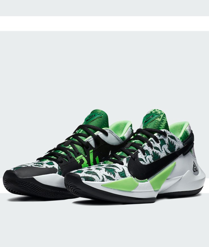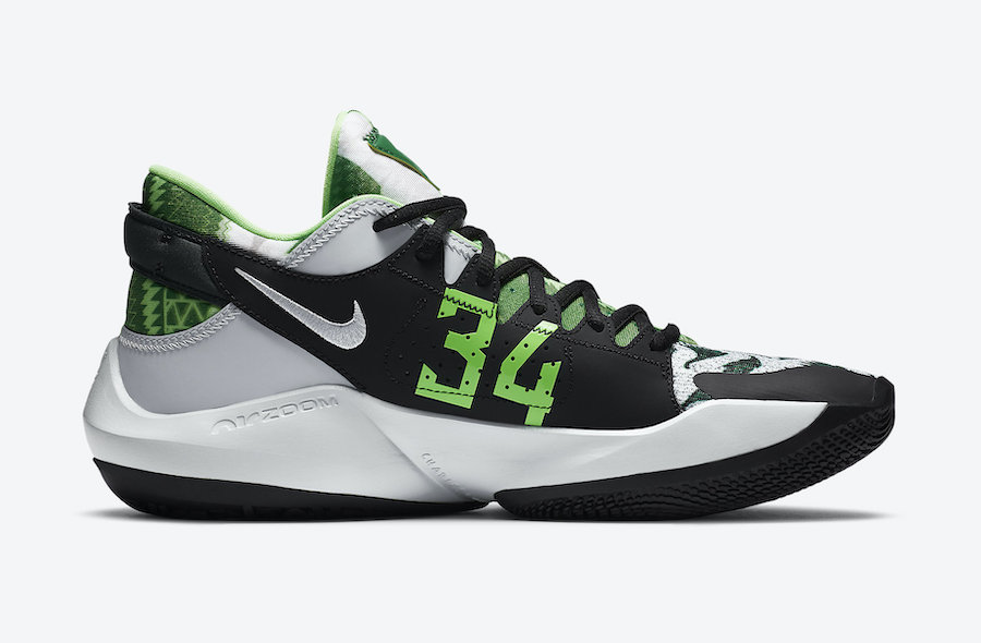 The upper features ancient Greek style paintings featuring various leaves decorating the whole shoe. The tongue of the shoe is dressed in different shades of green with zigzag patterns. The outsole featuring the names of Antetokounmpo brothers is black matching the embroidered logo on the side and the synthetic leather overlays.
