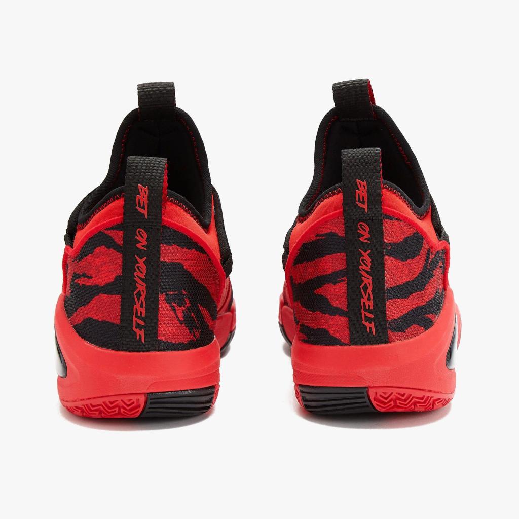 The other two colourways that are part of the pack are both inspired by Fred VanVleet’s team. The first colourway takes note from the vintage Toronto Raptors jersey. The upper uses the Toronto Raptor’s signature dark purple mixed with black. Red accents are applied adding additional detail to the shoe. The second colourway takes a more bold approach to represent the Toronto Raptors as the heel and the toe area is dressed in raptor scratch prints. It’s one of the most striking colourways out of the three as it uses a simple palette of bright red and black. The two colourways also feature VanVleet’s logo, however it was been given Raptor details. The heel tab on these colourways read “Bet On Yourself”.