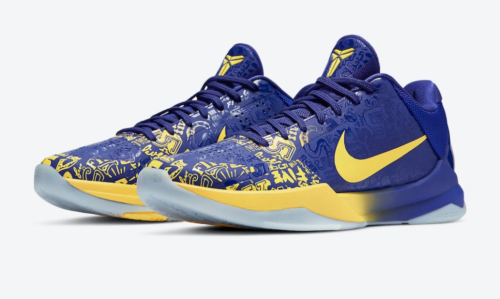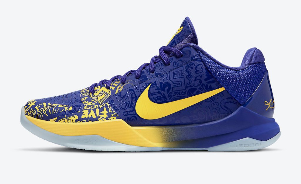 After an initial release overseas, the Kobe 5 Proto “5 Rings” is set to release in the States this month. As limited as the Kobe 5 Protos are, each colourway thats been released are all carefully built to tell Kobe’s story and carry his philosophy and legacy. This specific colourway looks to celebrate his astonishing accomplishment of winning 5 NBA Championships. Over the synthetic navy upper features a graffiti style print which features various fonts of the word and number “5”. Matching the blue and yellow gradient midsole, the print shifts from its background colour to a bright yellow adding more depth to the colourway.