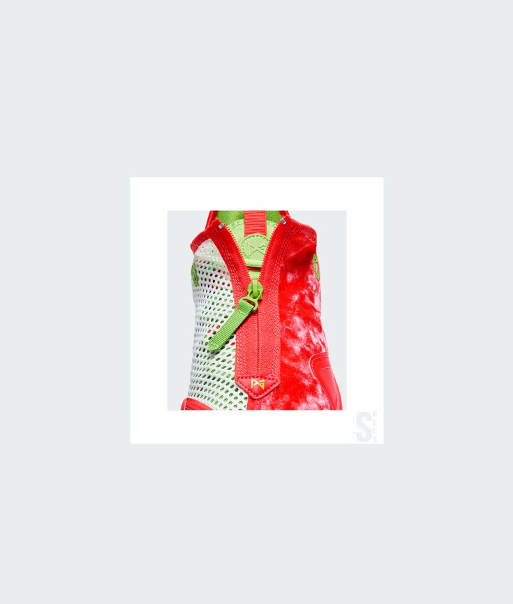 The upper is made up of a velvet like material, giving the shoe a soft and cosy aesthetic. Also the ‘glove’ like construction gives the upper a simple and clean look, reminiscent of a Christmas sock. The hand-crafted feeling around the shoe is also empathised by the exposed stitching around the Nike logo on the side. The green accents around the shoe along with the green inner lining, balances the overall redness of the shoe to complete a classic Christmas look. Christmas details are included in the insole, where a festive “PG” logo is decorated with Christmas lights.