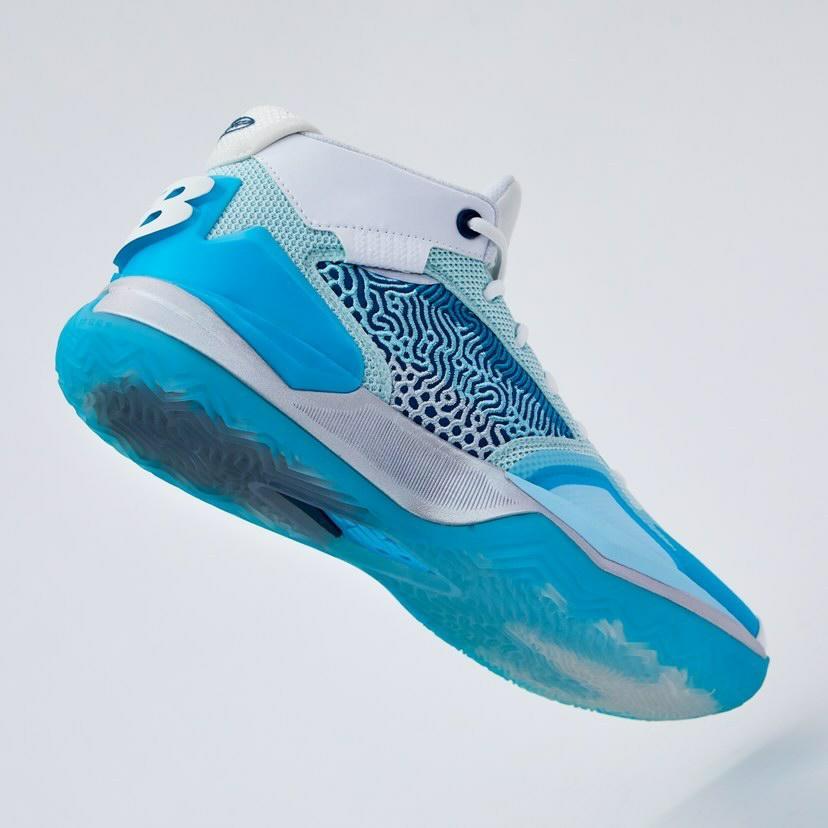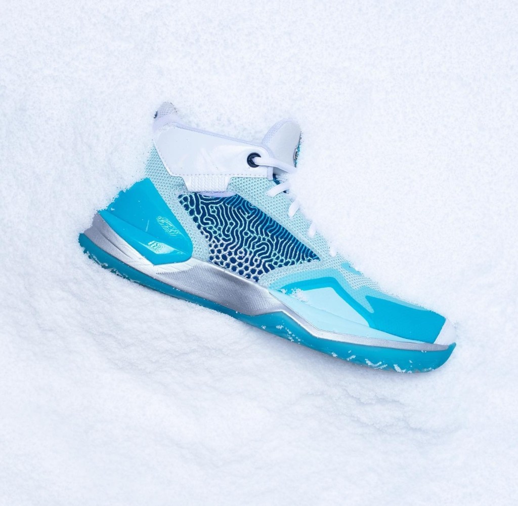 The colourway uses a range of cool hues across the upper. Over the light blue base, darker shades of blue are used on the toe and the heel. The midfoot embroidery panel also has layers of different shades of blue adding more depth and detail into the colourway. On the white tongue, features the claws of a snowman(Yeti) holding a basketball; a reference to Kawhi Leonard’s nickname “The Klaw”. Under the metallic midsole, a blue icy outsole completes the “Snowman” look of The Kawhi.