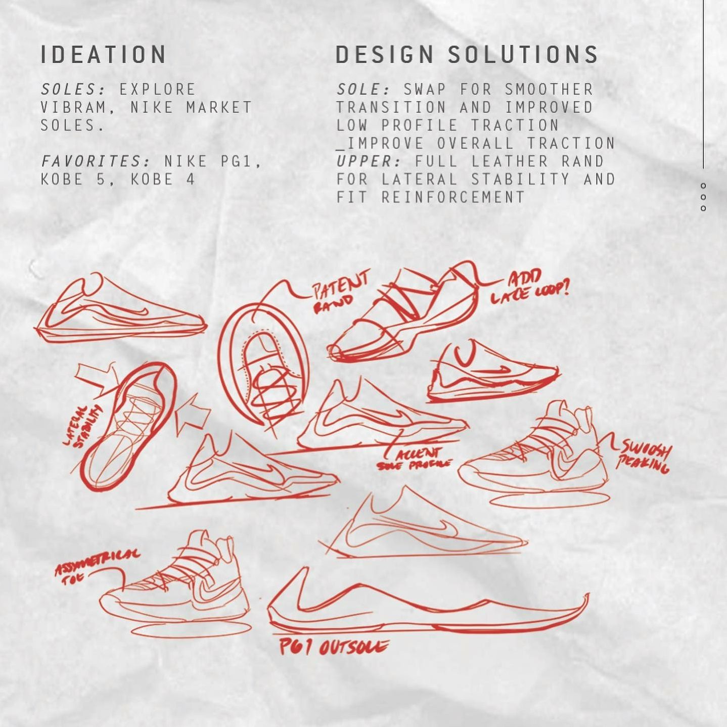 The initial idea of “performance tuning” came up when both Gonzalez and Gee played in the Kobe AD Exodus. “It was a great looking shoe aesthetically… But let down by some of the performance aspects” Gonzalez explains. “The grooves and the material choice for the translucent rubber wasn’t right,” Gee adds, “Problem was that it put my foot at a slight tilt. So, the lateral side of my foot was in contact first”. The performance issues with the Kobe AD Exodus laid the groundwork for the case study, building upon the question, “How can we actually improve or tailor a product according to our performance needs as athletes, and design something that addresses the problem with tangible solutions”.